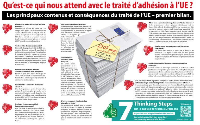 Nos droits populaires perdront toute valeur puisque le droit européen prévaudra sur le droit suisse. L’initiative pour la durabilité « Pas de Suisse à 10 millions », par exemple, pourra être invalidée par l’UE car elle est contraire à la libre circulation des personnes.